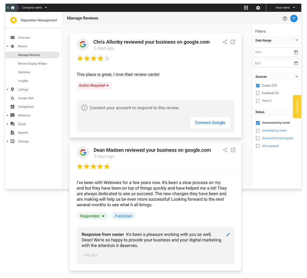 Track and respond to reviews across the most important platforms while gaining insights into your presence on additional sites. With new sources added regularly, you’ll always have a complete view of your online reputation.