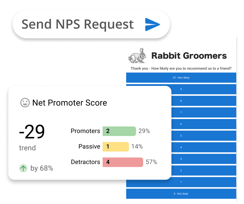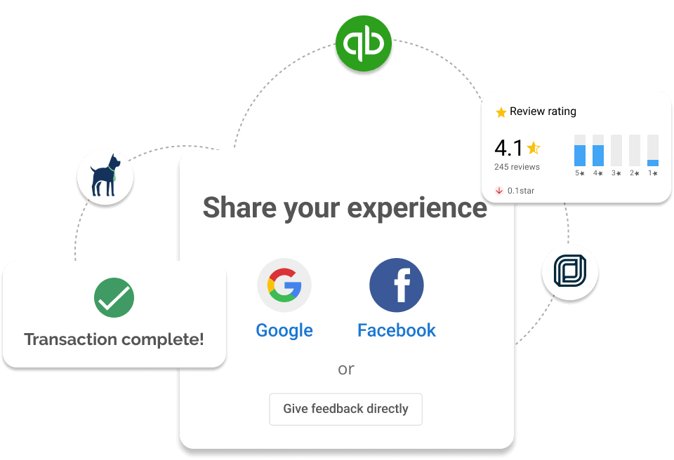 Gather NPS scores and customer reviews automatically after a purchase or service. Integrate seamlessly with apps like QuickBooks Online, PetExec, Jobber, and more to keep feedback flowing without extra effort.