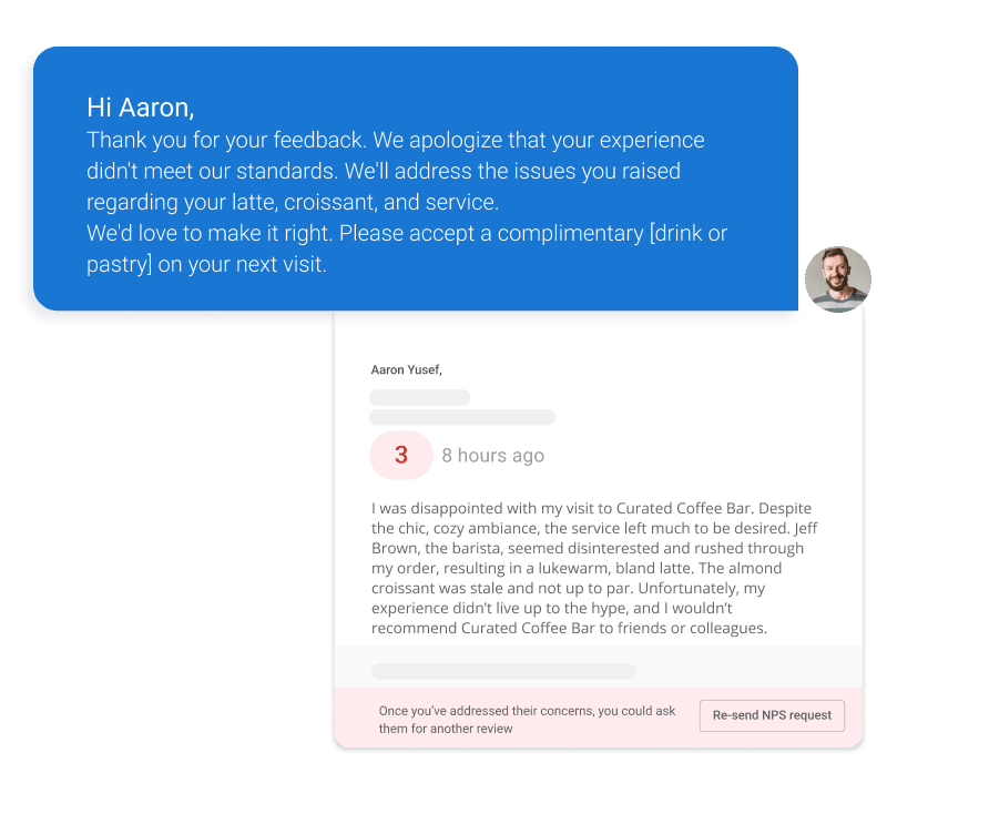 Gauge customer satisfaction with NPS (Net Promoter Score) before requesting reviews. Highlight positive experiences to amplify great feedback, while identifying and addressing concerns from less satisfied customers to keep them coming back.