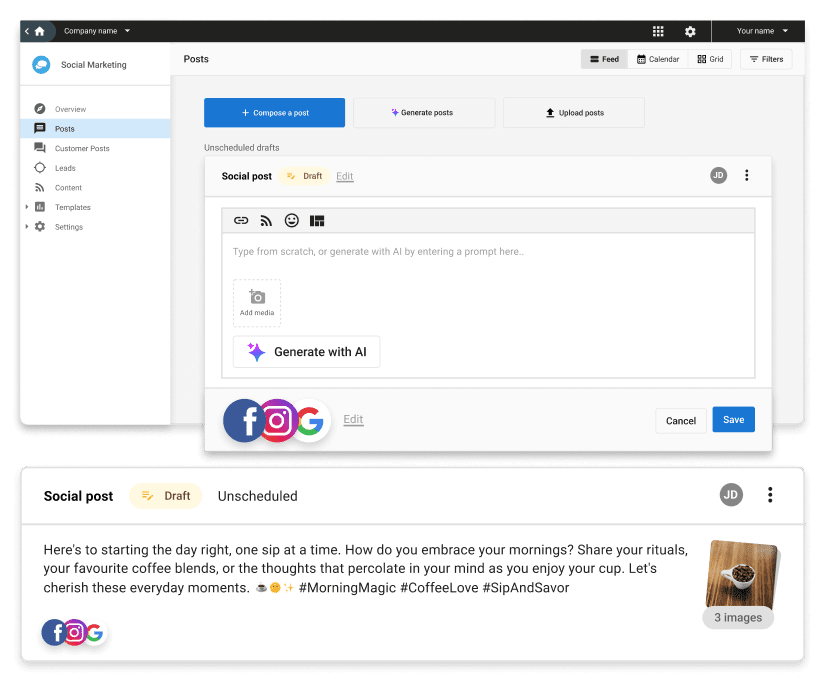 Create unique, on-brand social posts in seconds. Our AI uses your business profile and website to generate content that stays consistent across all your social channels and customer communications, helping you save time and maintain a professional online presence.